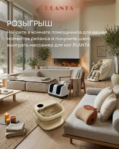🌸 Весенний розыгрыш от PLANTA Найдите в комнате помощников для ваших моментов релакса и получите шанс выиграть массажер для ног MF-4W Условия простые: ✅ Быть подписчиком Телеграм-канала PLANTA. ✅ Н