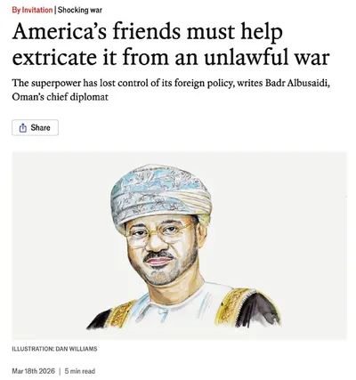 🇴🇲🇺🇸США колоссально ошиблись, позволив втянуть себя в войну с Ираном, заявил глава МИД Омана Бадр аль-Бусаиди в колонке для The Economist. По его мнению, Нетаньяху убедил Трампа, что удары по рук