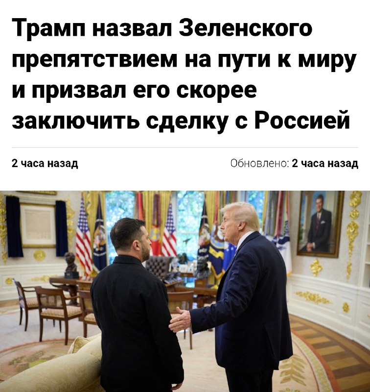 Трамп назвал Зеленского препятствием на пути к миру Американский лидер заявил Politico, что украинский президент не проявляет достаточной готовности к завершению войны. Он заявил, что в отличие от