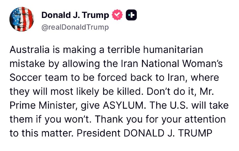 Дональд Трамп призвал Австралию предоставить убежище женской сборной Ирана по футболу. «Австралия совершает серьёзную гуманитарную ошибку, позволяя женской национальной сборной Ирана по футболу быть