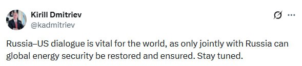 Спецпредставитель президента РФ Кирилл Дмитриев: Диалог между Россией и США жизненно важен для всего мира, поскольку только совместно с Россией можно восстановить и обеспечить глобальную энергетическу