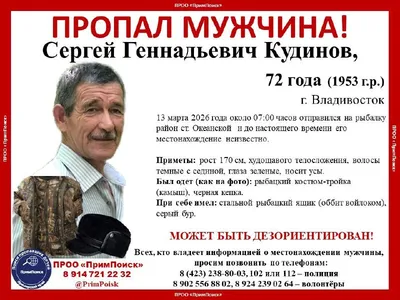 ДО СИХ ПОР НЕ НАЙДЕН! Сергей Геннадьевич Кудинов пропал 13 марта во время рыбалки в районе ст. Океанской. После фазы активных поисков спасателями МЧС при взаимодействии с сотрудниками полиции ОП 6