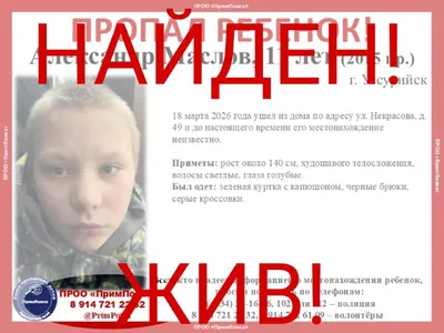 ВНИМАНИЕ! ПРОПАЛ РЕБЕНОК! Александр Маслов, 11 лет (2015 г.р.) г. Уссурийск 18 марта 2026 года ушел из дома по адресу ул. Некрасова, д. 49 и до настоящего времени его местонахождение неизвестно.