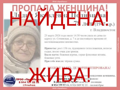 ВНИМАНИЕ! ПРОПАЛА ЖЕНЩИНА! Лидия Яковлевна Поливцева, 78 лет (1947 г.р.) г. Владивосток 23 марта 2026 года около 14:50 часов ушла из дома по адресу ул. Сочинская, д. 7 и до настоящего времени её м
