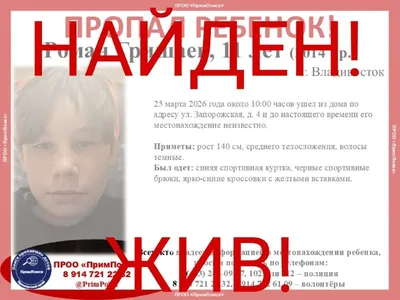 ВНИМАНИЕ! ПРОПАЛ РЕБЕНОК! Роман Гришаев, 11 лет (2014 г.р.) г. Владивосток 25 марта 2026 года около 10:00 часов ушел из дома по адресу ул. Запорожская, д. 4 и до настоящего времени его местонахожд