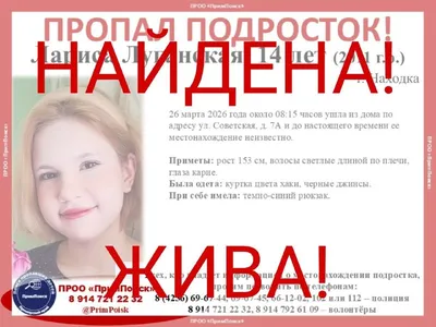 ВНИМАНИЕ! ПРОПАЛ ПОДРОСТОК! Лариса Луганская, 14 лет (2011 г.р.) г. Находка 26 марта 2026 года около 08:15 часов ушла из дома по адресу ул. Советская, д. 7А и до настоящего времени ее местонахожде