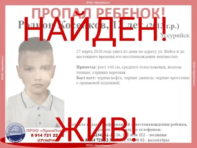 ВНИМАНИЕ! ПРОПАЛ РЕБЁНОК! Родион Косенков, 12 лет (2013 г.р.) г. Уссурийск 27 марта 2026 года ушел из дома по адресу ул. Вейса и до настоящего времени его местонахождение неизвестно. Приметы: рос