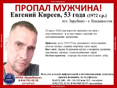 ВНИМАНИЕ! ПРОПАЛ МУЖЧИНА! Евгений Киреев, 53 года (1972 г.р.) пгт. Зарубино - г. Владивосток 23 марта 2026 года перестал выходить на связь с родственниками и до настоящего времени его местонахожден
