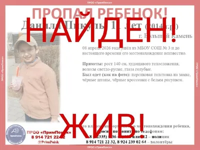 ВНИМАНИЕ! ПРОПАЛ РЕБЕНОК! Данила Пикуль, 11 лет (2014 г.р.) г. Большой Камень 08 апреля 2026 года ушёл из МБОУ СОШ № 3 и до настоящего времени его местонахождение неизвестно. Приметы: рост 140 с