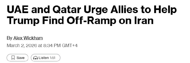 ⚡️ОАЭ и Катар хотят убедить США сократить сроки операции против Ирана Страны рассчитывают сформировать коалицию для быстрого дипломатического урегулирования конфликта. Абу-Даби и Маскат срочно усилив