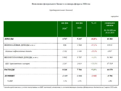 🏦 Минфин почти выполнил план на год по дефициту бюджета По итогам января-февраля 2026 года федеральный бюджет сложился с дефицитом в размере 3,449 трлн рублей, что на 1,032 трлн рублей выше уровня а