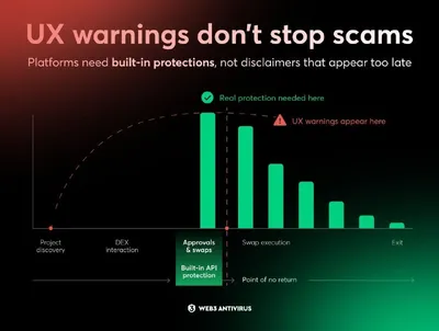⚠️ UX-предупреждения не спасают от скамов в Web3 На инфографике от Web3 Antivirus показано, почему обычные пользовательские предупреждения (UX warnings) часто бесполезны против мошенничества в крипте