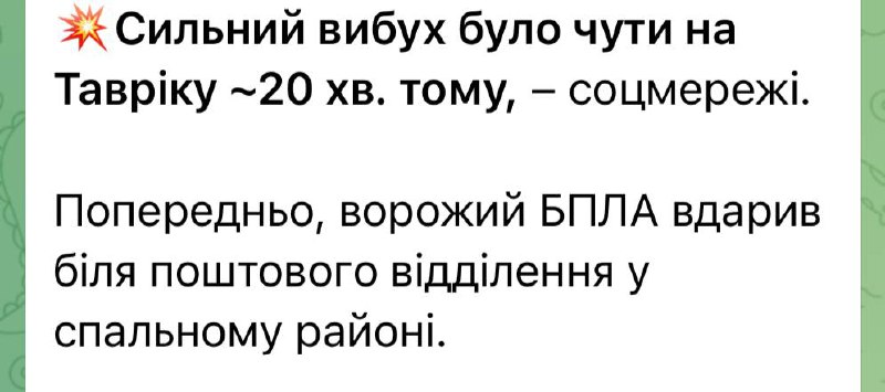 Оппоненты пишут о сильном взрыве в районе 14ч на микрорайоне Таврический в Херсоне. Предварительно прилет БПЛА в почтовое отделение
