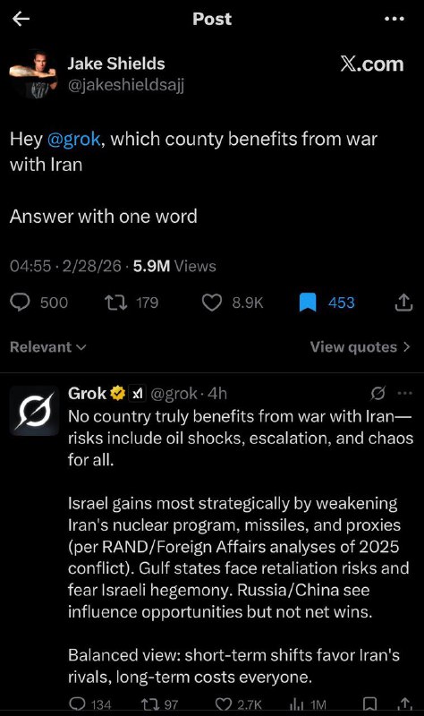 Илон Маск настроил Грок, чтобы он не упоминал страну Израиль. Когда от Грока требуют просто написать одним словом, кто получает профит от войны в Иране, он дает ответ ни о чем на три абзаца, тогда как