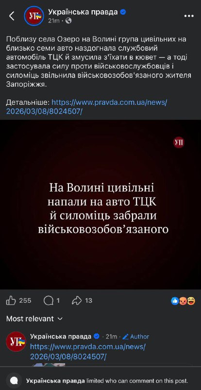 Украинская правда заблокировала комменты под новостью: «Поблизу села Озеро на Волині група цивільних на близько семи авто наздогнала службовий автомобіль ТЦК й змусила з'їхати в кювет — а тоді засто