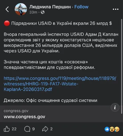 “Підрядники USAID в Україні вкрали 26 млрд $ Вчора генеральний інспектор USAID Адам Д Каплан оприлюднив звіт у якому констатується нецільове використання 26 мільярдів доларів США, виділених через USA