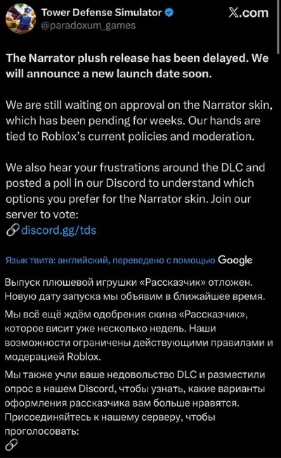 ⚠️ · Многие пишут насчет плюш Нарратора из TDS, хочу прояснить ситуацию, чтобы люди не попались на скам Нарратора еще нет в продаже, его релиз перенесли и еще не сказали, когда выйдет. Об этом сообщи