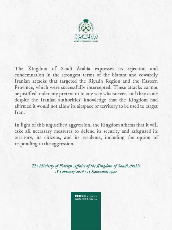 Министерство иностранных дел Королевства Саудская Аравия: Королевство Саудовская Аравия выражает своё решительное неприятие и осуждение в самых жёстких формулировках вопиющих и трусливых иранских ата