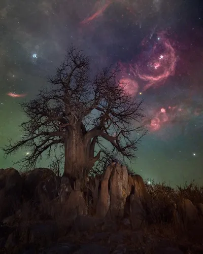 Туманность Ориона возвышается над баобабом в небе острова Кубу в Ботсване. Крайне низкое световое загрязнение неба в этом месте создаёт прекрасные условия для астрофотографии. Credit: Vikas Chander (