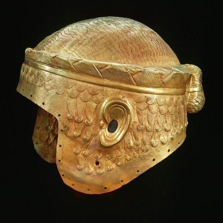 Древнегреческие шлемы, которые я показала вчера, конечно, очень красивые, но скрывают прическу. В отличие от шлемов шумерских, которые всячеки ее подчеркивали (от кудряшек до хвостика). На фото золот