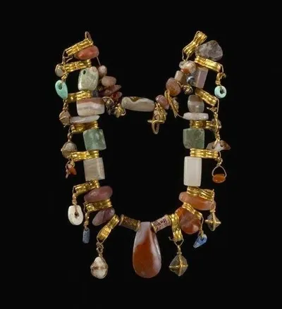 Ожерелье из драгоценных и полудрагоценных камней в изящной золотой оправе, Ассирия, среднеассирийский период (XIV-XIII вв. до н.э.). Обратите внимание на разнообразие камней и их огранку. Коллекция П
