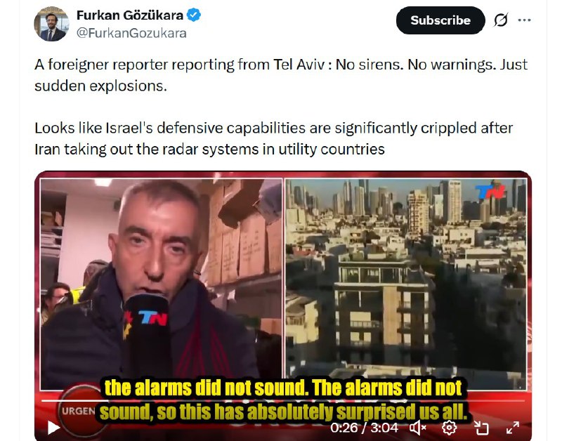 Похоже ПВО израиловки—фсьо, почти. Журналисты в Тель Авиве прячутся в бомбоубежищах и рассказывают, что взрывы вокруг а сирены воздушной тревоги молчат. А как они могут звучать, когда систему раннего