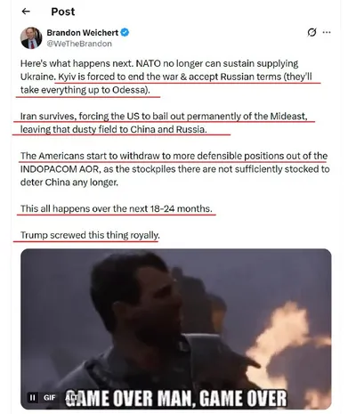 Мой хороший приятель Брэндон Вайкерт (он редактор по военным делам The National Interest) вполне себе сделал нормальный прогноз. Перевод: НАТО не может больше поддерживать руину. Куев вынужден соглаш