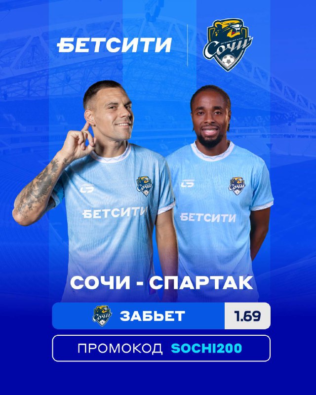 🔝 Принимаем «Спартак»! 🎁 Наши друзья из БЕТСИТИ дают кэф 1.69 на гол «Сочи» и утраивают депозит до 200 000 рублей всем новым игрокам! ➡️ Заходи по ссылке, регистрируйся с промокодом SOCHI200 и доб