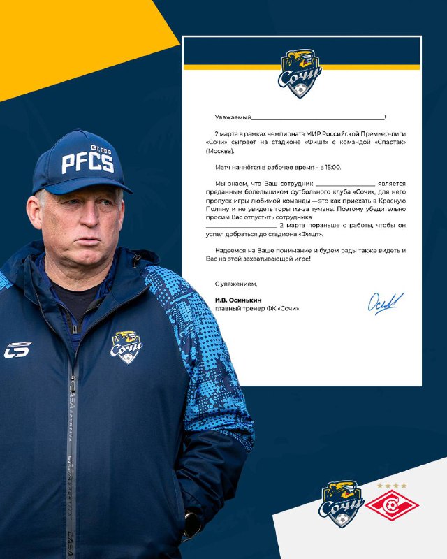 Матч «Сочи» – «Спартак» пройдет завтра в 15:00. Ранее приобретенные билеты действительны 🎟 Если вы не сможете посетить встречу, возврат билетов доступен по ссылке. Всех болельщиков, которые придут