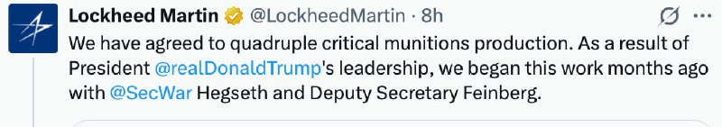 Крупнейшая оборонная компания в мире Lockheed Martin объявила, что по запросу Трампа и главы Пентагона наращивает производство оружия. «Мы договорились увеличить производство критически важных боепри
