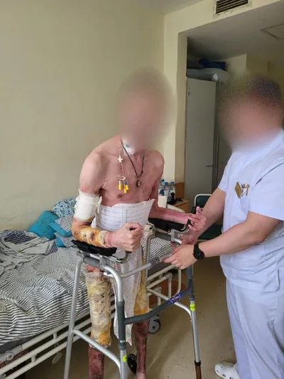 На фото - клинический психолог Фонда "Своих не бросаем" Лана Юрьевна Елгунова и Боец Микула. Микула получил минно-взрывное ранение. Множественные осколки, перелом правой руки, сложный перелом левой