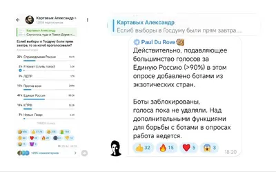 ✈️ Павел Дуров прокомментировал один из популярных постов паблика, по поводу накрутки голосов в опросах. Сообщил, что функции для борьбы с накрутками — в процессе Павел прям активничает 😁