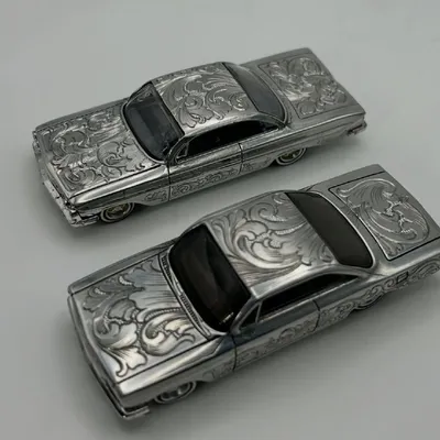 Игрушечные машины превратили в мини-арт с гравировкой. Мастер по имени Луго оформил модели Chevrolet Impala ’61 и ’62 от Hot Wheels, покрыв их детальным орнаментом. Узор проходит от багажника через