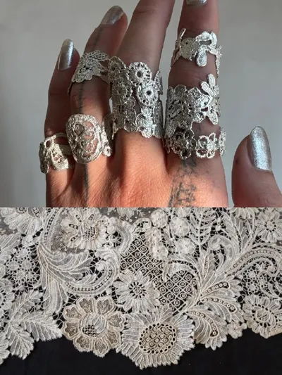 Парижская ювелирщица выпустила кольца из КРУЖЕВА. Коллекция состоит из 9️⃣ уникальных украшений — каждое сделано из винтажного кружева, поэтому повторить их в точности невозможно. Баба Зина из соседн