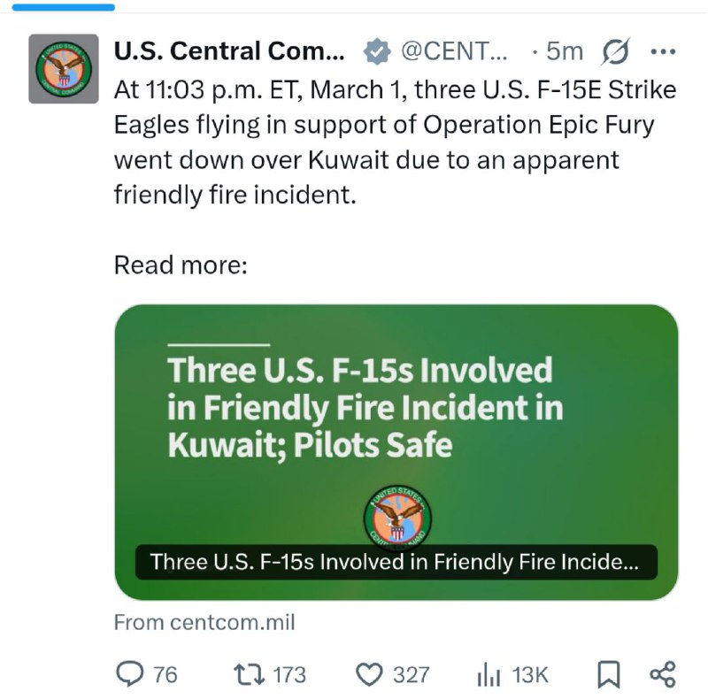 🇺🇸🇰🇼 Американцы подтвердили потерю 3 истребителей F-15 в Кувейте. Причиной называют ПВО Кувейта. "1 марта три американских истребителя F-15E Strike Eagle, выполнявшие задачи в рамках операции «Эп