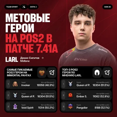 Larl тоже поделился своим топом на мидлейн 👀 Несмотря на то, что у Invoker наибольшее количество матчей, винрейт у него хуже всех в этом списке 😖 А как часто вы играете на этих героях в миде? 👇🏼