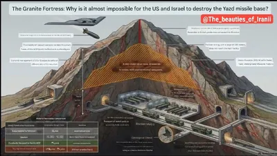 🇮🇷🔴 Некоторые ракетные города Ирана захоронены на глубине 500 метров в гранитной горе в Йезде. 🔻 Самая мощная противобункерная бомба США — GBU-57 MOP — проникает на 60 метров в бетон. Объект нахо