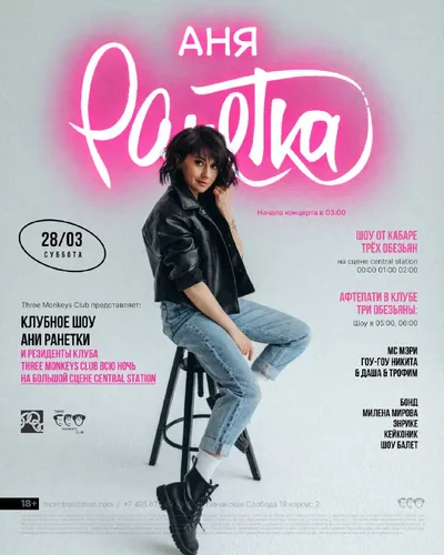 🔥 СУББОТА • 28 МАРТА 🔥 Клуб Three Monkeys устраивает грандиозную вечеринку на большой сцене клуба Central Station 🎉 🎙 КЛУБНОЕ ШОУ АНИ РАНЕТКИ с главными хитами группы Ранетки! 🕒 Начало концерта