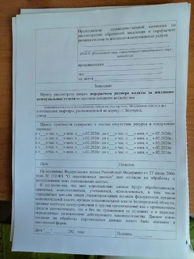 Поминутно фиксировать отсутствие отопления предлагают белгородцам для перерасчёта Управа №17 выдала местной жительнице Светлане Рыжковой шаблон заявления на перерасчёт платы за электричество, где нуж