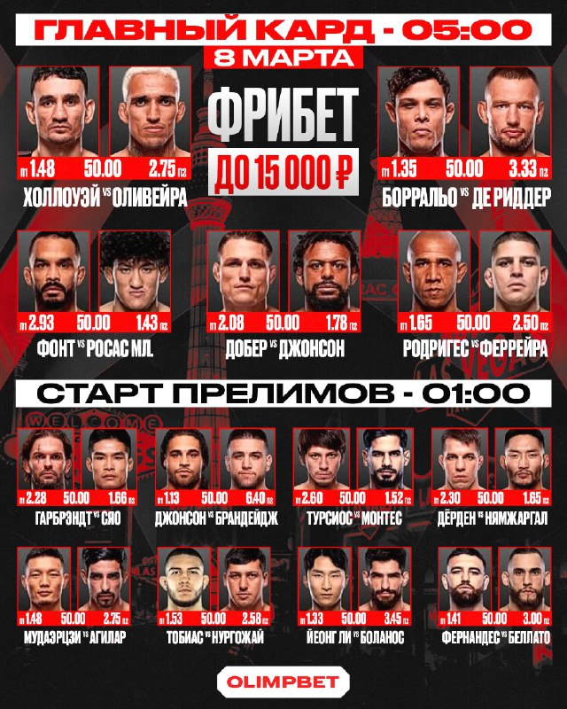 🗣 🥊🥊 🇧🇷🥊🇺🇸 UFC 326: Оливейра VS Холлоуэй Прелимы: 01:00 (мск) Главный кард: 05:00 (мск) Смотри турнир вместе с друзьями в уникальной атмосфере, в самом центре Москвы: OLIMPBET LOUNGE 🪙 Бр