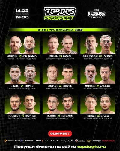 TOP DOG: Prospect 30 | FIGHT CARD! Турнир состоится в эту субботу, 14 марта в 19:00. ➡️Смотри прямую трансляцию на телеканале UDAR: — Ростелеком (Интерактивное ТВ) — Платформа Wink — Кинопоиск —