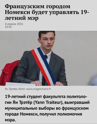 Юный мэр 19-летний парнишка выиграл выборы в небольшом городе Номексиво во Франции. Он на пять голосов обогнал действующего 62-летнего главу. Население города 2000 человек. Ян планирует совмещать