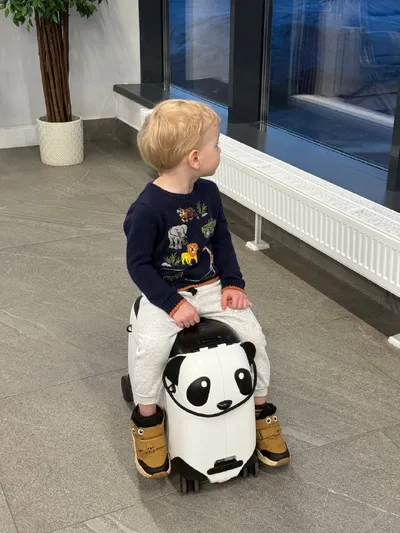 а вот чемодан-панда из списка подарков показал себя очень даже хорошо! 🐼 🟤Лев возил чемодан за веревку 🟤я катала Льва на чемодане, держа за лямку для переноски 🟤в него вместились игрушки/книжки