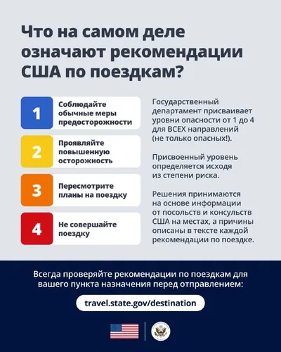 Государственный департамент присваивает уровни безопасности от 1 до 4 ВСЕМ направлениям для путешествий (не только опасным!). Уровень определяется исходя из рисков. Решения принимаются на основе инфор