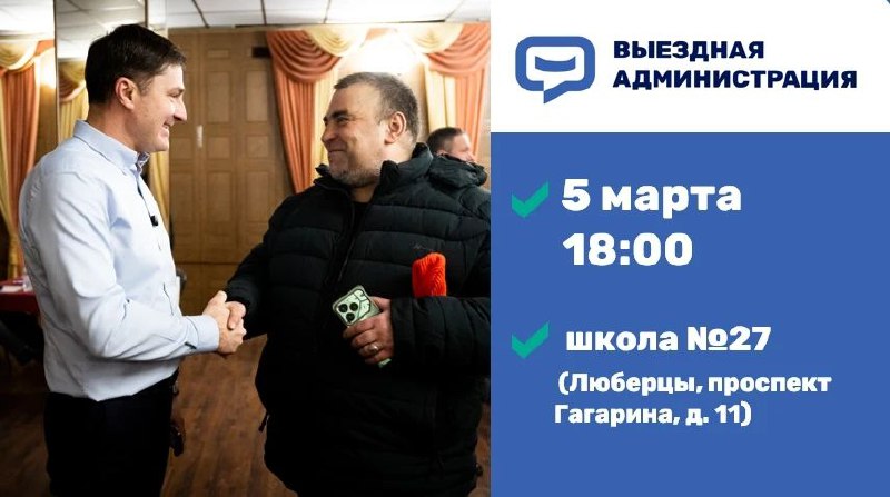 Уважаемые жители! В четверг, 5 марта, проведём встречу с жителями в формате выездной администрации. Вы сможете задать интересующие вопросы всем ответственным лицам. 📍 Встреча состоится в школе №27