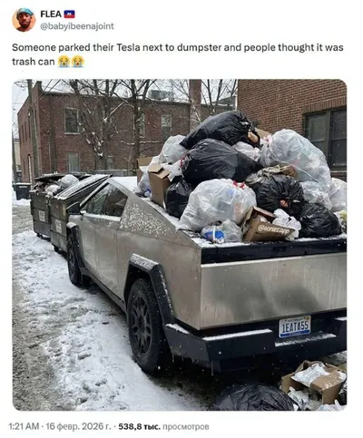 Кто-то припарковал Cybertruck возле мусорных баков и прохожие решили, что это ещё один контейнер 😂 На прямом эфире как раз обсуждали Cybertruck и мнения разделились. Что думаете? 👍 - Клевый, я бы