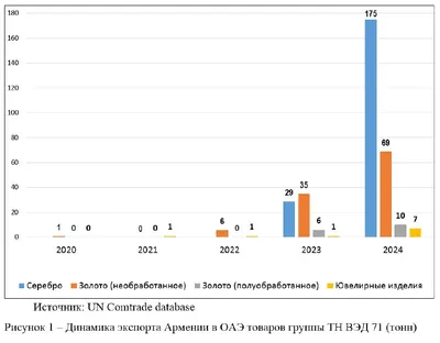 В 2024 г. Армения экспортировала в ОАЭ: – серебро - 175 тонн – золото необработанное - 69 тонн – золото полуобработанное - 10 тонн – ювелирные изделия - 7 тонн