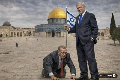 Амихай Элиягу, израильский министр по культуре и наследию опубликовал сегодня в его Твиттере вот такую картинку с турецким президентом Эрдоганом стоящим на коленях перед Нетаниягу и иерусалимской мече