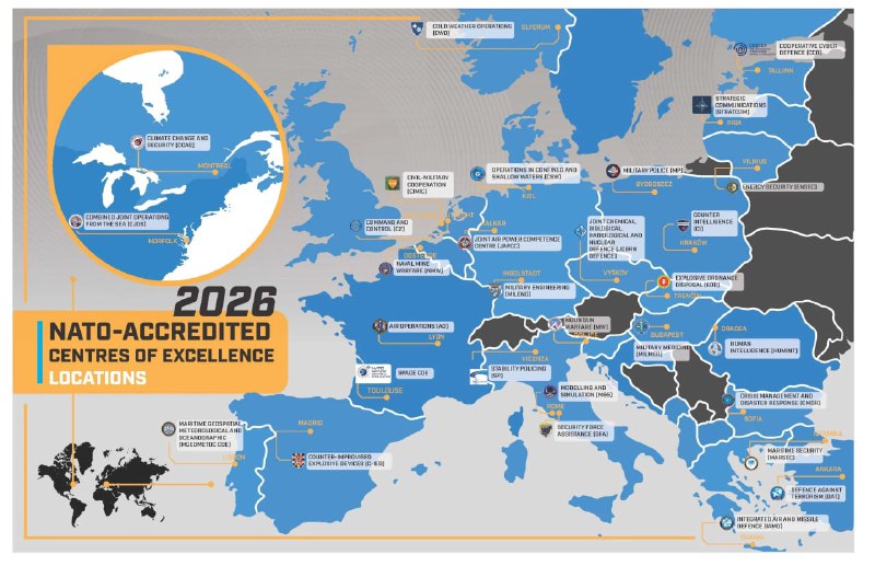 Центры передового опыта НАТО (COE), 2026 1. Пространственная логика Карта показывает концентрацию COE в Восточной и Центральной Европе — от Балтии до Балкан. Для нас это важно, потому что именно