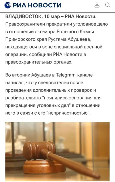 Бывший мэр Большого Камня Рустям Абушаев сообщил о прекращении уголовных дел в его отношении По словам Абушаева, после проведения дополнительных проверок следователи пришли к выводу о его непричастно